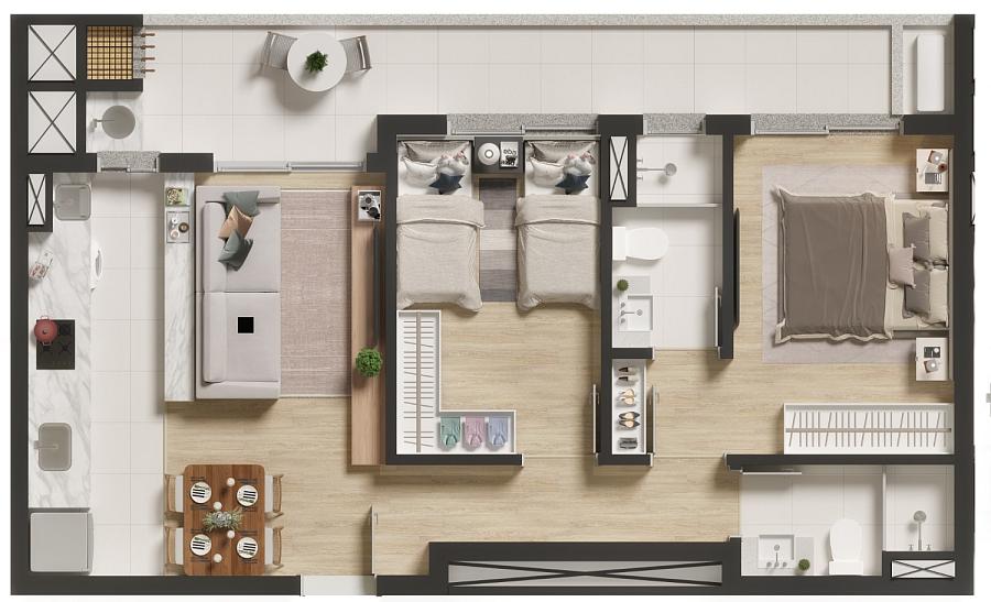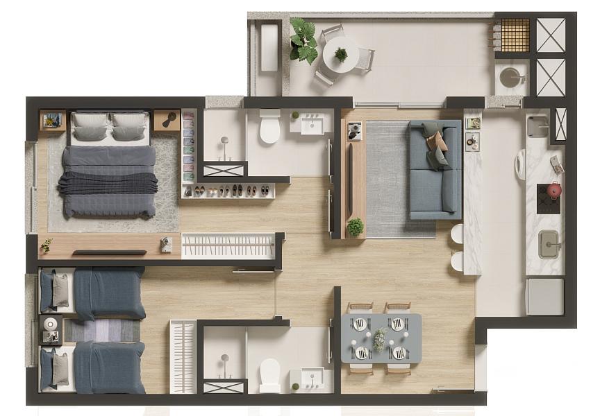 O Curaçao Homeclub também conta com outras unidades disponíveis de 68,96m² a 75,74m², com opções de 2 dormitórios.