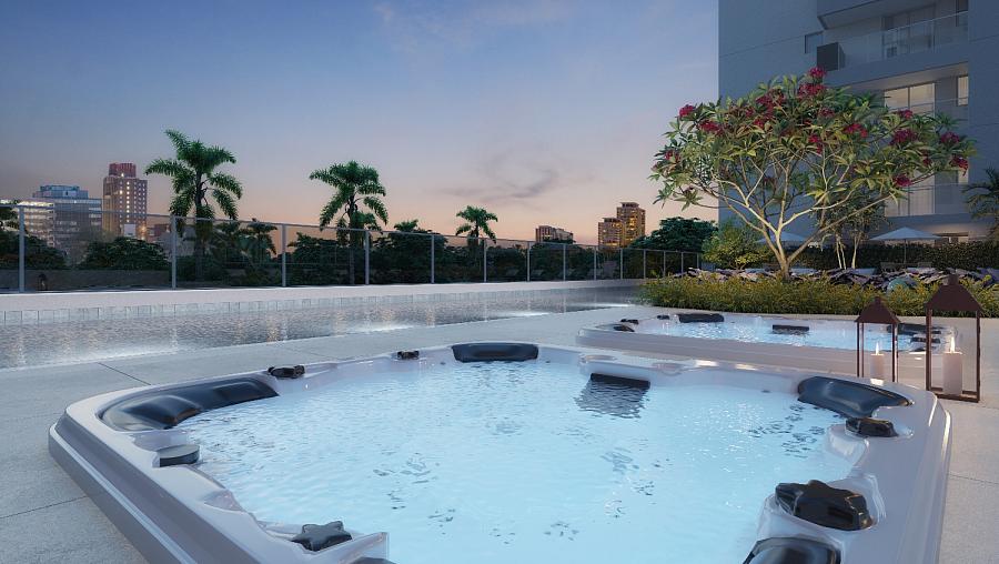 Sinta o prazer de ter um espaço externo privativo em um home club completo, a poucos passos do mar.