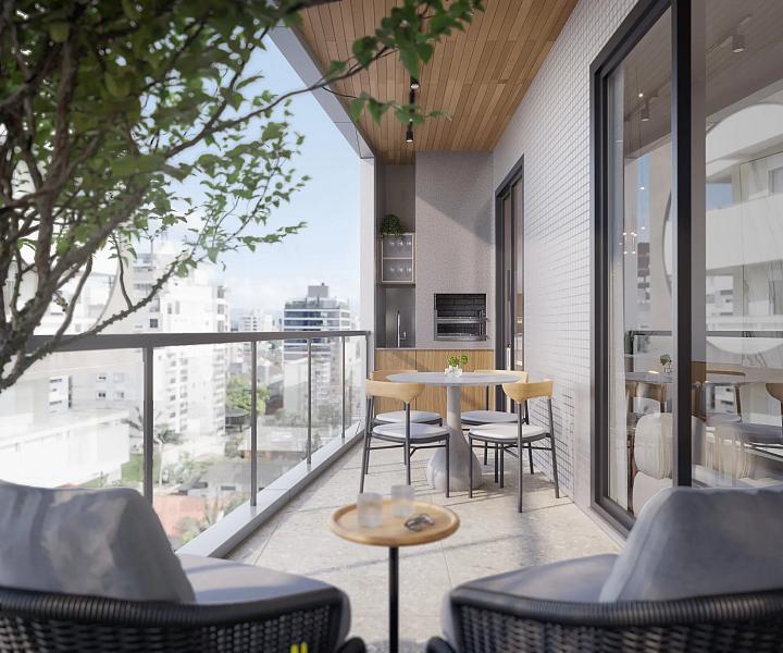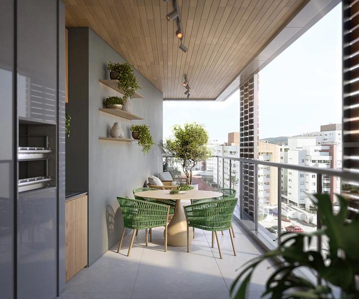 - Varanda gourmet e living integrados com ventilação cruzada
