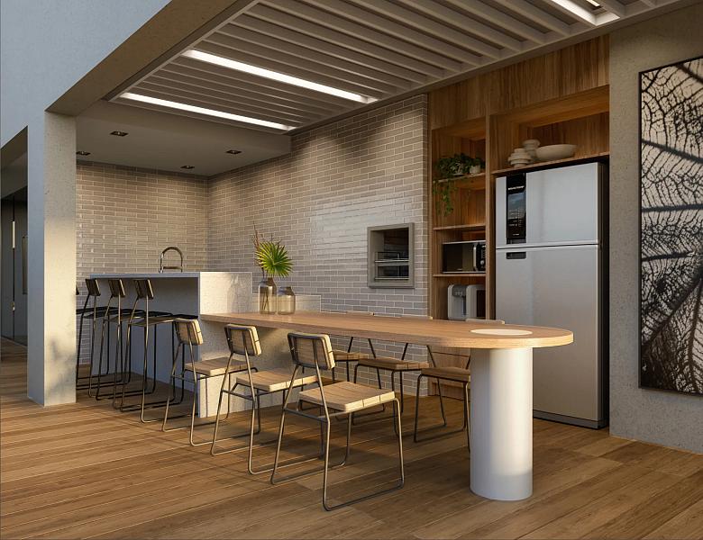 - Varanda gourmet e living integrados com ventilação cruzada