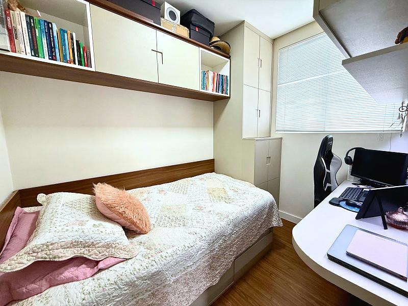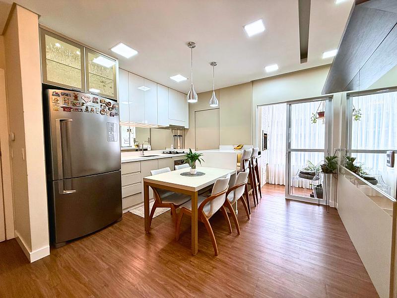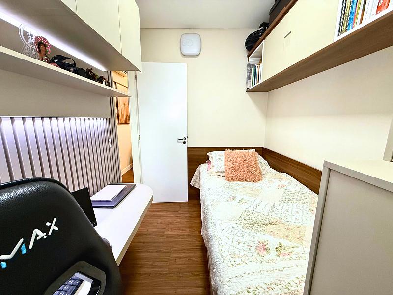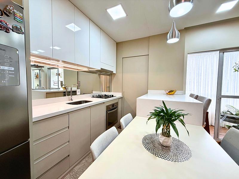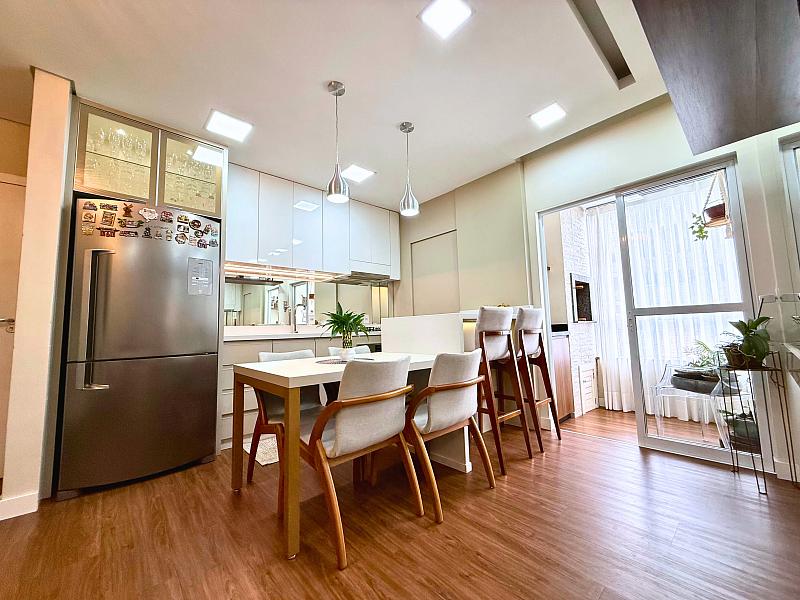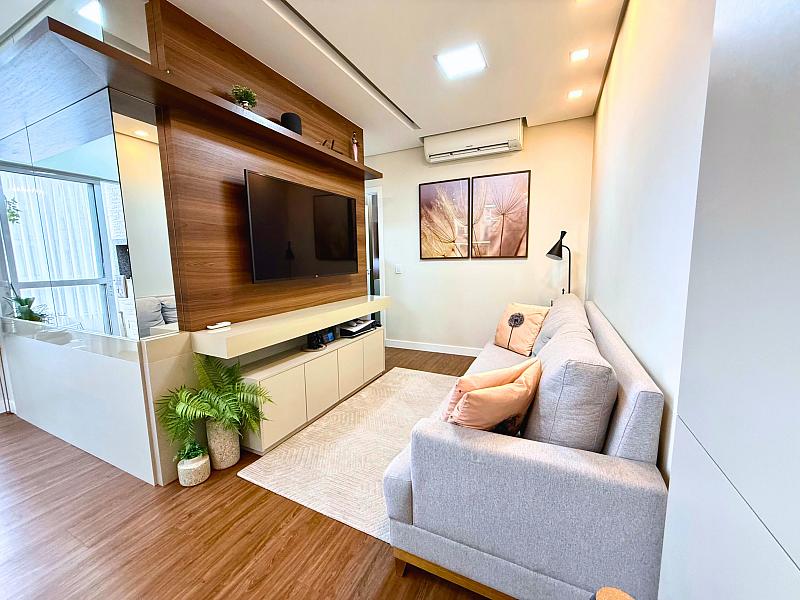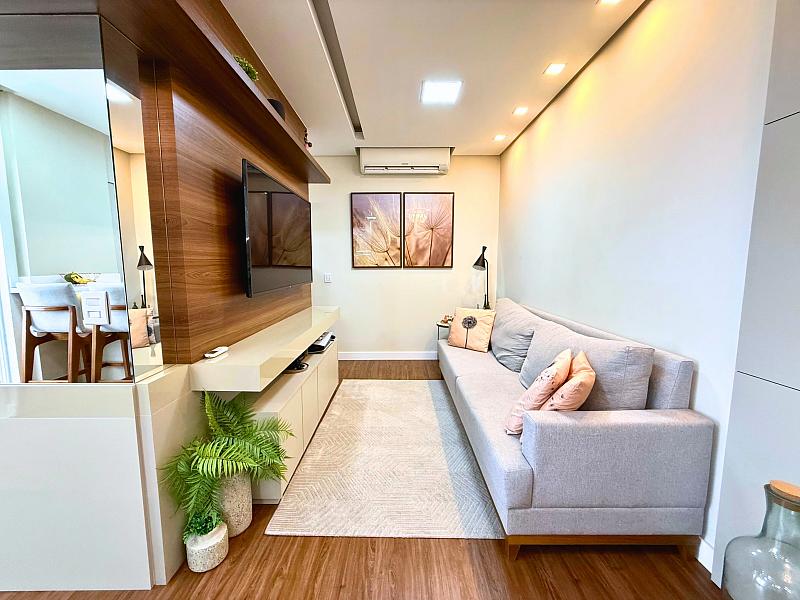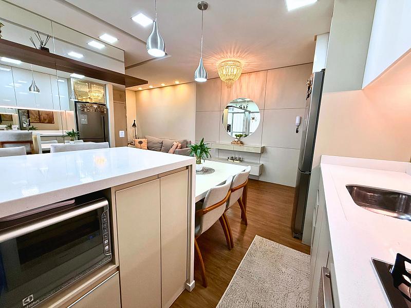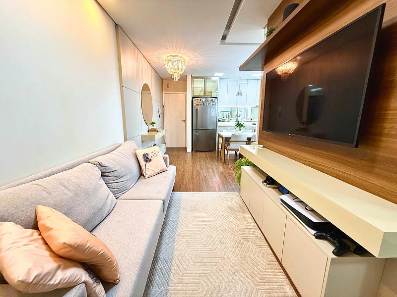 Apartamento impecavelmente mobiliado, com projeto inteligente voltado ao máximo aproveitamento de espaço e praticidade. São 61m² privativos, distribuídos em 1 suíte com sacada, 1 dormitório com estação de home office, banheiro social, sala de TV com bom dimensionamento, cozinha em ilha e lavanderia separada.