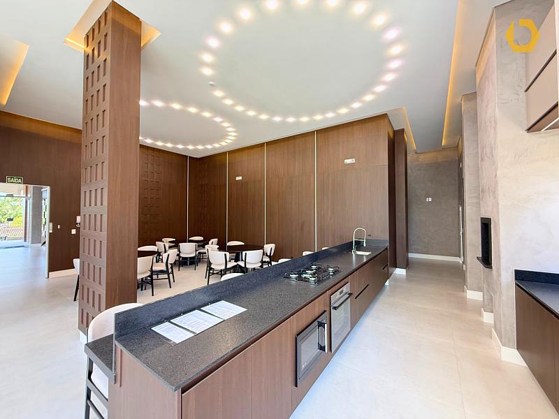 Living integrado com cozinha e churrasqueira à carvão;