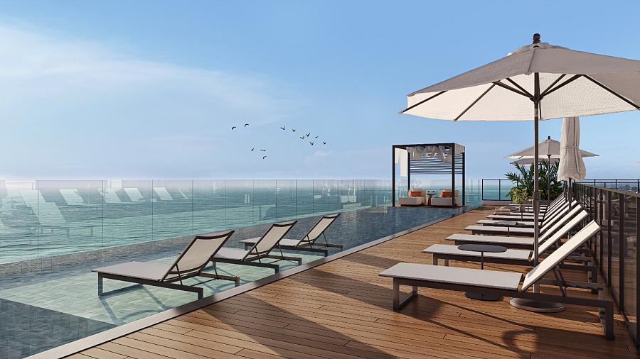 • Piscina principal com borda infinita e tratamento por ozônio.