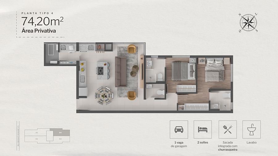 Apartamento de 74,20m² com 2 Suítes no Rosskamp Residence – Anita Garibaldi, Joinville
