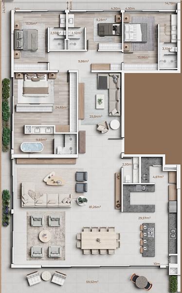 O empreendimento também dispõe de outras unidades de 162m² a 369m², com opções de 3 a 4 suítes.