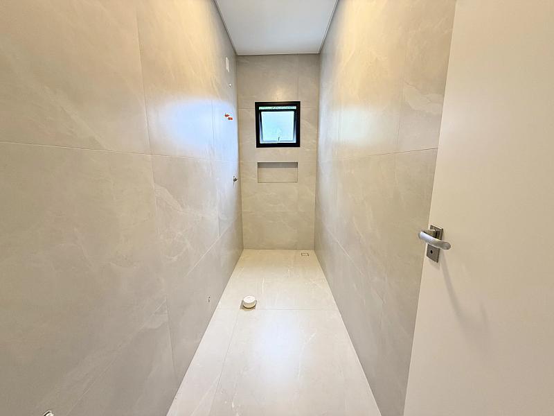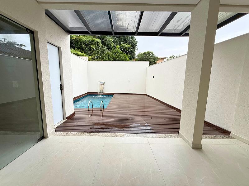 A área gourmet com churrasqueira integrada à piscina privativa com cascata cria o cenário perfeito para momentos de lazer, enquanto as amplas portas e janelas garantem luminosidade e ventilação natural.