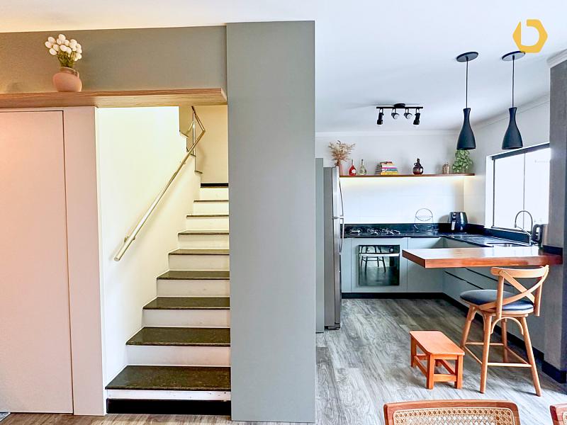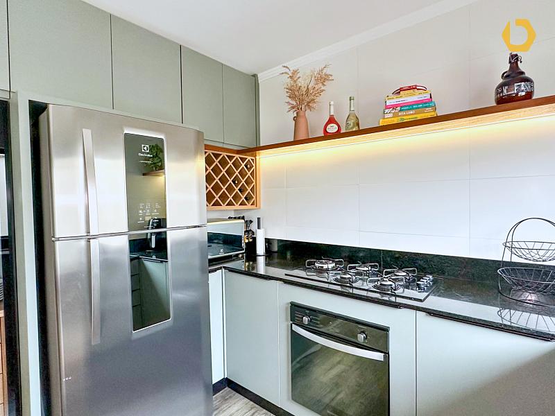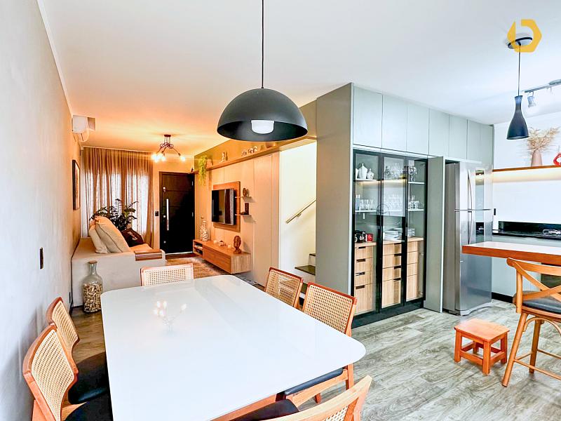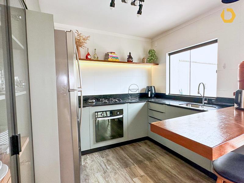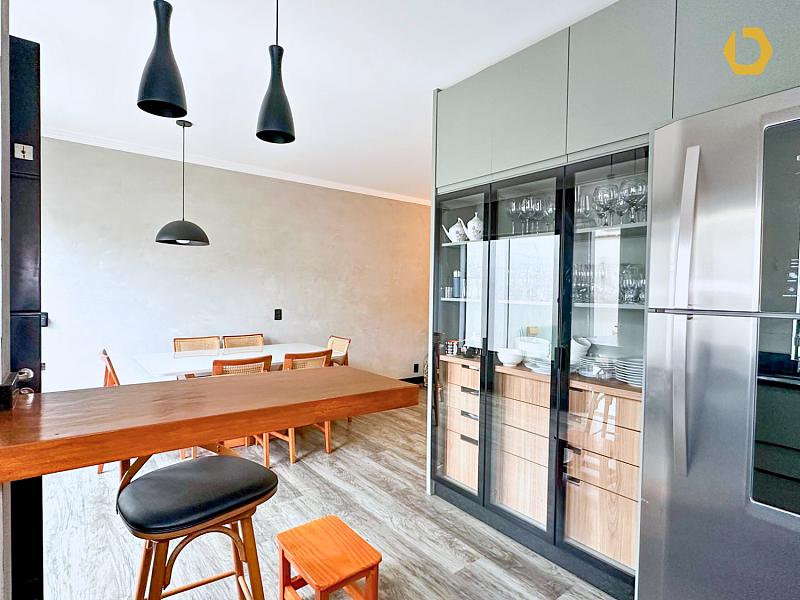 No pavimento térreo, o living totalmente integrado reúne sala de TV, estar e jantar, criando um ambiente amplo, fluido e muito agradável. A cozinha é generosa, bem ventilada e iluminada, pensada para quem gosta de espaço e praticidade.